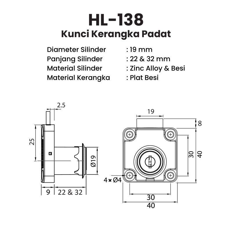 - Isi: 1 x Kunci Silinder Huben HL-138 22mm , 2 x Anak Kunci