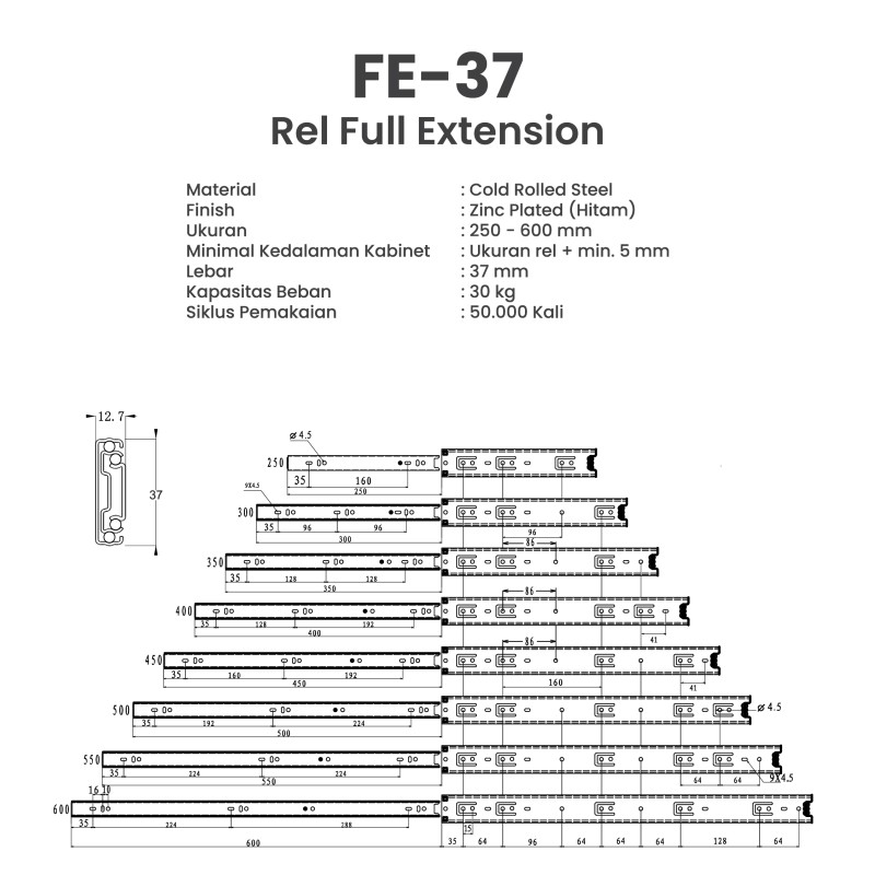 Rel laci Huben FE-37 dirancang untuk membuka penuh dengan gerakan yang halus dan senyap. Terbuat dari baja berkualitas tinggi dengan finishing anti karat, tahan lama, dan tidak mudah bengkok. Cocok digunakan untuk laci dapur, meja kerja, lemari, dan kabinet.